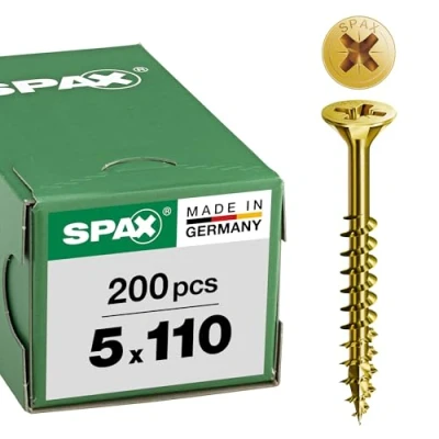 MULTI head : For easy and simple material penetration and screwing. Mills in wood and stops on metal. Optimal force transmission and better fit on the cross recess size Z2 Power and battery saving: no need for pre-drilling (depends on wood). Reduced splitting of wood due to 4CUT tip with 4 sides. Standard SPAX corrugated profile for easy separation of wood fibers Made in Germany : TUV certified. Officially approved: European Technical Approval for self-tapping screws for assembling wood (ETA-12/0114) Contents: 1 SPAX box, 200 universal screws, Cross recess Z2, Countersunk head, Partial thread, 4CUT point, YELLOX coating, Thread diameter (Ød1)= 5mm x Total Length (Ls) = 110mm, Length of partial thread (LgT) = 69mm, Head diameter (Ødk) = 9.7mm, Bit not included International products have separate terms, are sold from abroad and may differ from local products, including fit, age ratings, and language of product, labeling or instructions., Weight: 3.858089585 pounds, Manufacturer: Spax