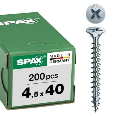 Use: universal for both indoors and outdoors without direct exposure to the elements. Exclusive Spax Wirox coating: corrosion resistance 20 times higher than that of conventional white zinc plating required under current standards. Multi countersunk head screw for easy penetration into the material and a simplified screwing. Screws into wood and stops at metal. Maximum transmission of power and better grip on the cross-shaped head. Save energy and batteries: No pilot hole needed (depending on the wood). Reduces splitting wood thanks to the 4CUT 4-sided tip. Typical Spax corrugated profile for easily separating wood fibres. Made in Germany: TÜV certified. Official approval: European technical approval for self-tapping screws as objects for wood assembly (ETA-12/0114). Contents: 1 Spax box, countersunk head, full thread, 4Cut tip, Wirox coating, cap not included., Weight: 1.1904962148 Pounds, Manufacturer: Spax