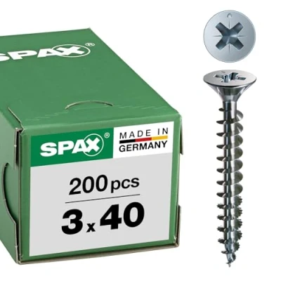 Use: universal for both indoors and outdoors without direct exposure to the elements. Exclusive Spax Wirox coating: corrosion resistance 20 times higher than that of conventional white zinc plating required under current standards. Multi countersunk head screw for easy penetration into the material and a simplified screwing. Screws into wood and stops at metal. Maximum transmission of power and better grip on the cross-shaped head. Save energy and batteries: No pilot hole needed (depending on the wood). Reduces splitting wood thanks to the 4CUT 4-sided tip. Typical Spax corrugated profile for easily separating wood fibres. Made in Germany: TÜV certified. Official approval: European technical approval for self-tapping screws as objects for wood assembly (ETA-12/0114). Contents: 1 Spax box, countersunk head, full thread, 4Cut tip, Wirox coating, cap not included., Weight: 0.5291094288 Pounds, Manufacturer: SPAX