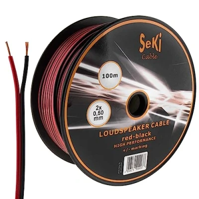 100 m SeKi speaker cable in red/black, the cable cross section is 2 x 0.50 mm², simple polarity marking by colour marking or a repetitive labelling on a conductor. The speaker cable / box cable has a high flexibility and break resistance and is therefore perfect for wiring your stereo system, audio system, HiFi system, boxes or your music system. SeKi speaker cables have a CE mark and a corresponding declaration of performance according to EU BauPVO No. 305/2011 and are therefore suitable and approved for permanent installation (also flush-mounted) within buildings. To create the best possible sound for a fair price in your HiFi environment, we rely on a CCA inner conductor. Our 100 m speaker cable 0.50 mm² red/black on reel. The speaker cable has no metre marking.