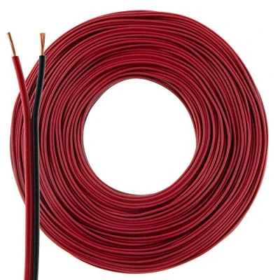 Speaker cable, audio cable, box cable with metre marking Cable cross section: 2x 0.75 mm², length: 50 m, colour of cores: red / black Inner conductor material: copper clad aluminium (CCA), inner conductor construction: 2 x 15 x 0.25 mm Width: 5 mm, height: 2.3 mm Plus + negative pole marking