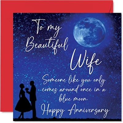MAKE THEM SMILE WITH THIS HEARTFELT ANNIVERSARY CARD: This exceptional quality anniversary card for her or him shows the design "To my Beautiful Wife Someone like you only comes around once in a blue moon. Happy Anniversary". If you are looking for funny anniversary cards for men, then then this happy anniversary card is bound to make them laugh. Not just for relationship gifts for women this could also be for Husband, Wife, Boyfriend, Girlfriend, Partner or Companion. WHAT DO YOU GET: The card is printed on one side and BLANK ON THE INSIDE to allow you to write your very own message. The unique fun design is printed on a specially sourced and environmentally responsible board. At 360 microns thick the natural white one-sided gloss board has a quality look and feel. Supplied with a coloured gummed envelope to complement the design and ready to be sealed and sent in the post. Wife anniversary card, Boyfriend anniversary card. NO INK SMUDGES: There is nothing worse than writing inside a card to find that the shiny surface makes the ink smudge. This is why we use a high quality one sided coated board. The uncoated side will absorb more of the ink from your pen to make smudging a thing of the past. Anniversary card Wife, anniversary card funny, anniversary card husband. SIZES: Greeting Card = 145mm x 145mm, Envelope = 155mm x 155mm, Card Thickness = 360 micron. Great Wife anniversary cards from Husband, boyfriend or girlfriend anniversary card. Husband anniversary card from wife, anniversary cards for Boyfriend. MADE AND QUALITY CHECKED IN THE UK: We print and manufacture all our product right her in the UK so you can be sure of a fast turnaround and a product that is expertly made. Using environmentally responsible premium board our card is conscious of the responsible management of the world's forests - anniversary cards for Husband, anniversary cards for Wife, funny anniversary cards for her, anniversary card for boyfriend.