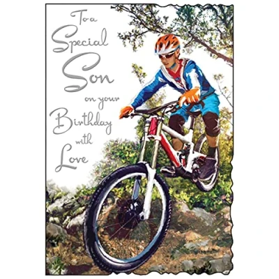 To a special Son on your birthday with love card, colourful cyclist on bike design Die cut edging and embossed foil finish Colour design insert leaf inside with message White envelope Size: 157 mm x 235 mm