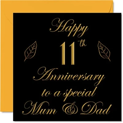 MAKE THEM SMILE WITH THIS HEARTFELT ANNIVERSARY CARD: This exceptional quality anniversary card for her or him shows the design 'Happy 11th Anniversary to a special Mum & Dad'. If you are looking for funny anniversary cards for men, then then this happy anniversary card is bound to make them laugh. Not just an anniversary gifts for Mum and Dad this could also be for Mother, Father, Parents, Step Dad or Step Mum. WHAT DO YOU GET: The card is printed on one side and BLANK ON THE INSIDE to allow you to write your very own message. The unique fun design is printed on a specially sourced and environmentally responsible board. At 360 microns thick the natural white one-sided gloss board has a quality look and feel. Supplied with a coloured gummed envelope to complement the design and ready to be sealed and sent in the post. Mum anniversary card, Dad anniversary card. NO INK SMUDGES: There is nothing worse than writing inside a card to find that the shiny surface makes the ink smudge. This is why we use a high quality one sided coated board. The uncoated side will absorb more of the ink from your pen to make smudging a thing of the past. Anniversary card Mother, anniversary card Father, anniversary card Parents.Steel anniversaries card. SIZES: Greeting Card = 145mm x 145mm, Envelope = 155mm x 155mm, Card Thickness = 360 micron. Great Mum and Dad anniversary cards from Kids, Mom or Papa anniversary card. Parents anniversary card from Son or Daughter, anniversary cards for Mum.11th wedding anniversary gifts, 11th anniversary cards. Mum anniversary gifts, Dad anniversary gifts, 11th anniversary gifts. MADE AND QUALITY CHECKED IN THE UK: We print and manufacture all our product right her in the UK so you can be sure of a fast turnaround and a product that is expertly made. Using environmentally responsible premium board our card is conscious of the responsible management of the world's forests - anniversary cards for Mum, anniversary cards for Dad, funny anniversary cards for her, anniversary card for Parents, 11 wedding anniversary cards.