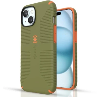 Speck iPhone 15 Plus Case Built for MagSafe, Drop Protection Grip 14 Scratch Resistant, Soft Touch, 6.7 Inch Phone CandyShell Bush Green/Pumpkin Pie