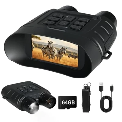 【Stunning 4K UHD Video & 36MP Photos】-- Experience clearer night viewing with these 4K digital night vision goggles, featuring a high-sensitivity sensor and 5-level adjustable IR illumination for total darkness. Capture bright 36MP photos and ultra-HD videos, perfect for wildlife observation, night patrols, camping and outdoor security. 【Long-Range Viewing with 11× Zoom】-- These infrared night vision binoculars offer 5.5× optical zoom and 11× digital zoom, allowing you to spot targets up to 1000m in daylight and 400m at night. Ideal for hunting, surveillance, property protection and long-distance wildlife watching, ensuring you never miss critical details. 【Large 3'' HD Screen for Clear Real-Time Viewing】-- Featuring a bright 3-inch TFT display with multiple brightness levels, these NV goggles deliver crisp real-time images even in low light. The enlarged 1.5× eyepiece and intuitive menu make it easy to track movement, adjust IR strength and switch modes—ideal for beginners and experienced users alike. 【Record, Save & Replay Every Night Adventure】-- Capture full-colour daytime shots or sharp infrared night footage with the built-in photo and video recording functions. Comes with a 64GB TF card (supports up to 128GB), allowing you to store hours of 4K videos and thousands of images—perfect for hunting trips, camping memories or security evidence. 【Long Battery Life Assurance】-- Equipped with a high-capacity 5000mAh rechargeable battery, these night vision goggles deliver reliable 6 hour+ performance in the field—ideal for long hunting sessions, wildlife tracking and night patrols. Enjoy extended usage both day and night without constant recharging, and rely on the built-in tactical flashlight with SOS mode for added safety during outdoor adventures.