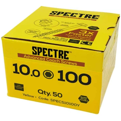 General description Box of 50 ForgeFix Spectre™ Coach Screw Hexagon Head ZY M10 x 70mm. Spectre™ Advanced Coach Screws are three times faster than a regular coach screw, featuring a hex flange head and a 60-degree deep single thread. The quick start type 17 slash point eliminates the need for a pilot hole in most cases, although some hardwood may still require pre-drilling. They are surface hardened with an anti-corrosion Zinc Yellow coating for increased durability. Technical specifications Product type: Coach Screw Head type: Hexagon Size: M10 x 70mm Quantity: Box of 50 Thread type: 60-degree deep single thread Point type: Type 17 slash point Other information Socket driver included UKCA/CE approved for use in load-bearing timber construction