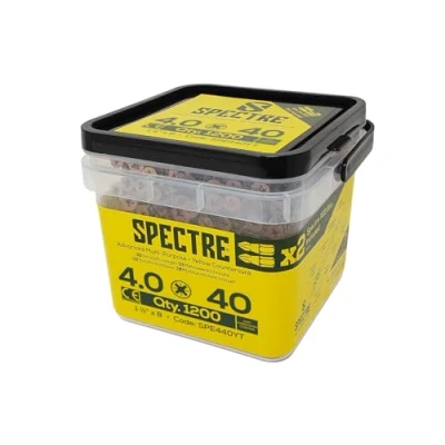 General description Spectre by Forgefix incorporates advanced features typically found in premium screws, making them ideal for various wood applications. These advanced multi-purpose wood screws are designed for durability and ease of use. Technical specifications Size: 4.0 x 40mm Thread: Fully threaded Pack Quantity: Tub of 1,200 Finish: Zinc yellow passivated for excellent corrosion resistance Head Type: Countersunk, pozidrive compatible, recessed head Thread Design: Sawtooth thread to prevent splitting, reamer to prevent jacking (for screws 50mm and above) Point Type: Quick start type 17 slash point Other information CE approved for use in load-bearing timber construction