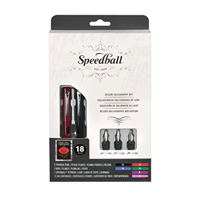 USE Calligraphy fountain pen set offers the ideal combination of comfort and value. Precisely machined nibs with a rounded tip, lightweight ergonomic construction and free-flowing ink provide a superior writing experience, to create beautiful results CONTENTS Speedball Deluxe Calligraphy Fountain Pen Set includes 2 Speedball Calligraphy Fountain Pen, 3 Fountain Pen Nibs 1.1mm, 1.5mm, 1.9mm and 12 Ink Cartridges 2 Blue, 2 Black, 2 Red, 2 Purple, 2 Green, 2 Pink, and The Speedball Textbook RANGE Offering the ideal pairings of nibs and holders that are specifically catered to suit a range of calligraphy or illustration projects, Speedball Pen Sets provide a convenient and value-priced means to stock (or re-stock!) your artist tool box GIFT Makes a great present for any creativity enthusiast, or lover of art and craft. Pen set can be used for creative lettering, diy cards, invitations, announcements, caligraphy, scrapbooking or journaling. Ideal tools for art and craft tool kit BRAND Speedball’s rich history of manufacturing fine art and craft tool began in Camden, NJ in 1899. Speedball’s offerings have grown but their dedication to providing customers with superior products at an affordable price remains the same