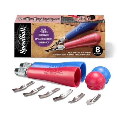 LINO CARVING TOOLS - Ideal for carving linoleum, Speedy Cut, Speedy Carve, other and soft substrates. Great for detailed pumpkin carvings. ASSORTED SIZES – This linoleum cutter kit contains (1) each of the following: #1, #2, #3, #4, #5, #6 lino cutters. There is a size for every job. INCLUDES TWO HANDLES – Also includes two lino handles (red and blue). It is made from hard plastic, with a comfort grip. The removable end is perfect for storing the linoleum cutters. QUICK TO CHANGE – The hand-adjustable metal chuck makes changing out lino cutters super fast and easy. The twist off handle offer convenient storage. MADE IN THE USA – The Speedball Linoleum Cutter Assortment #2 is designed and made in the USA.