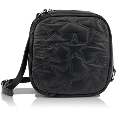 faux leather handbag Debossed stars or plaid pattern Long adjustable shoulder strap Textile interior