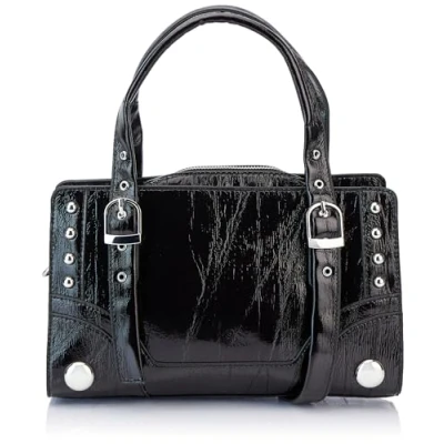 Faux patent leather handbag With rivets and buckles Handle Detachable and adjustable shoulder strap Textile inner lining