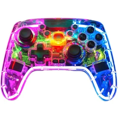 Impressive LED lighting: The transparent controller for PC, Nintendo Switch, OLED, Android and PS3 offers multi-colour RGB lighting with various adjustable RGB lighting modes (can also be switched off) in the housing and has DirectInput and XInput compatibility Wireless USB or Bluetooth: Wireless connection to computer or game console via 2.4G USB-A nano receiver dongle or Bluetooth 5.3 - also wired operation during charging via the supplied USB-C/USB-A charging/data cable, length 2m High-end operation: Two additional programmable macro buttons on the underside for the middle finger, the internal macro memory saves the settings independently of the device. The additional buttons and the latest Hall sensor technology in the analogue sticks and triggers enable individually configurable precision gaming fun, the turbo auto-fire button can be set for short bursts of fire or continuous fire Double vibration feedback: Double-sided vibration for an even more realistic gaming experience (intensity adjustable, can also be switched off), configuration of the vibration function in DirectInput mode also possible on the PC via downloadable driver Motion control: The motion control sensor uses 6-axis gyroscope technology to recognise the precise tilt, position and acceleration of the RAIT NX game controller, motion control only for Nintendo Switch & Steam Power battery: The 600mAh rechargeable lithium-ion battery lasts for over 8 hours of playtime, charging time approx. 2 hours, dimensions: 150 x 106 x 60mm, weight: 205g, Platforms: Windows