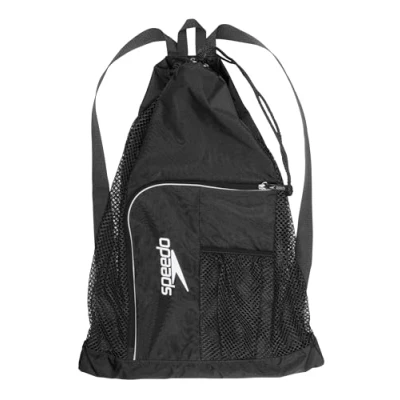 Simple, easy-close drawstring design Ideal for storing wet kit and training aids Quick-drying and durable mesh design Backpack-carry design Handy space-saving design - folds into small zipper pouch while not in use