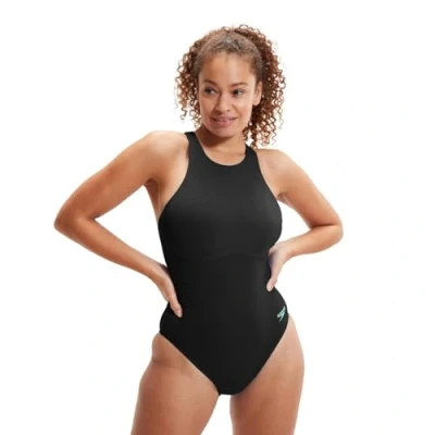 Speedo Womens Racer ZIP Swimsuit WITH Built IN SWIM BRA Swimsuit, Women's, Size: 30, Black/harlequin green
