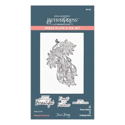 Elegant Peacock Press Plate & Die Set is from the Peacock Paradise Collection by Dawn Bibby. The largest press plate imprints a fabulous detailed peacock with floral accents on each side. Also included are three sentiment plates with matching thin metal cutting dies to pop up and highlight the greeting. Change the way you create with BetterPress, an innovative way to achieve the elegant look of letterpress without all the mess. It’s an easy-to-use system that produces professional stationery style with detailed impressions that can be felt to the touch. Ink the plates with the BetterPress Ink to be pressed against the BetterPress Cotton Card Panel and Sheets for a crisp letterpress design. The peacock plate measures 3.75 x 5.50 in./9.50 x 13.90 cm, the sentiments and matching dies vary in size from 2.15 x 1.35 in./5.40 x 3.40 cm to 1.40 x 1.15 in./3.60 x 2.90 cm.