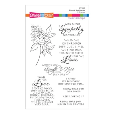 Sincere Sentiments Clear Stamp Set is part of the All the Sentiments Collection by Stampendous with a set of nine stamps. Send expression of comfort during difficult times through this set. There are several to choose from and comes with a sweet floral sprig for just the appropriate accent. Clear stamps are made in the USA from high quality photopolymer for clear, defined impressions. Cling stamps are designed to be used with a clear stamping block, sold seperately. These sentiments come in a variety of sizes ranging from 1.74 x 2.80 in./4.50 x 7.10 cm to 1.40 x 0.40 in./3.60 x 0.40 cm.