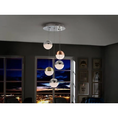 LED lamp of 5 lights. Made of metal, chrome finish. Polycarbonate spherical shades of 2 cm. with texture inside and metal finished in satin copper, satin brass and chrome. Adjustable length. 24W LED. 3000 K. 1,440 lm. DIMMABLE. Remote control inclu
