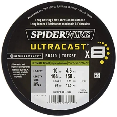 SPIDERWIRE ULTRACAST BRAID combines the best of Spiderwire performance into an eight-strand braided line, constructed using a cold-fusion process for added durability and abrasion resistance. EXCELLENT PERFORMANCE: Whether fishing with spinners, plugs, plastics, or blades, this versatile braided line fits the bill. HIGH STRENGTH PER DIAMETER BRAIDED FISHING LINE: Ideal for freshwater and saltwater alike. Fishing line break strength of 20lb | 9kg. Braid Length: 164yd | 150m. Ultimate Braid-Moss Green is "high-vis" ideal for line watchers to increase strike visibility. EFFORTLESS CASTING: Reduced diameter at the same strength as larger braided lines. This line will glide off the reel and into the water - and back again. WIDE RANGE OF BREAK STRENGTHS AVAILABLE, from 4 pounds to 100. Diameter of 0.006in | 0.15mm helps ensure that exciting fights end well. Superline Mono Equiv: 8lb.
