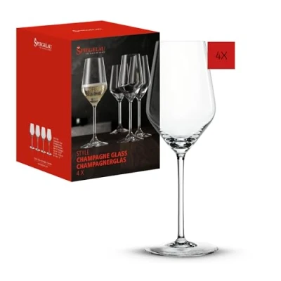 4-piece champagne glass set, for the festive table or as a gift for your loved ones, elegant look thanks to thin-walled, uncut and colourless glasses Sophisticated glass architecture: developed in collaboration with well-known sommeliers and restaurateurs - glass goblet in shape, size and diameter perfectly matched to sparkling wines and champagne Optimisation of sensory impressions: unfolding of the aroma in quality and intensity, emphasis on the diverse mouth feeling, harmonious and lasting aftertaste, balance of the ingredients Made in the EU: dishwasher-safe, no impairment of quality after numerous washes, increased break resistance, high-quality workmanship of the purest ingredients and special raw materials Box contents: 1x Spiegelau champagne glass set of 4, style, 4670185, material: crystal glass, capacity: 310 ml, height: 22.3 cm, diameter: 7.5 cm