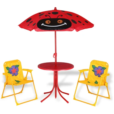 Spielwerk® Children's Outdoor Seating Set Kids Garden Furniture 2x Floral Folding Chairs Round Table UV40 Umbrella with Ladybug Design Red & Yellow