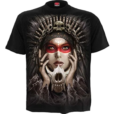 We are not native to her shores, hence we cower in the shadows below canopies of autumn leaves. The howling wail of a distant wolf pack heralds the arrival of a terrible, ferocious inevitability. We were not invited yet we shall never leave. T-Shirt Black is made of Top Quality 100% Cotton, Jersey using skin friendly, Azo-free, Reactive dyes. Established since 1990, Spiral has been consistently rolling out cool merchandise for the Gothic and Heavy Metal markets. Spiral is not just a brand …it's an ATTITUDE! Where 'Art meets Fashion', Spiral artwork covers a range of themes from tribal, gothic, horror, fantasy and fetish to the more cute and cuddly along with Spiral's own take on various TV and Film characters, all screen printed to last. Just one of the unique from a huge range of Alternative Fashion products from Spiral!