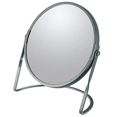 ELEGANT AND VERSATILE DESIGN: Modern style round standing mirror, ideal for the bathroom, dressing room or bedroom, blends perfectly into any interior. CONVENIENT DOUBLE MIRRROR - One side with classic mirror for a natural mirror image and the other with 5x magnification for precise makeup, hair removal or facials. 360° Rotation: swivel head to adjust the mirror angle according to your needs, providing comfort and flexibility in your daily routine. STABILITY & QUALITY: Durable steel construction and solid base ensure good stability on all surfaces, even with prolonged use. EASY TO MOVE & STORE Compact and lightweight format, it can be easily transported from room to room and does not take up space in your rooms.