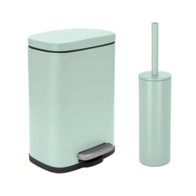 STYLISH AND MODERN DESIGN - This set includes a 5 litre pedal bin and a matching toilet brush, both with a stylish matte finish. The sleek and distinguished design brings a touch of modernity and sophistication to your bathroom or toilet Functionality and practicality: The bin is equipped with a slow and silent closing mechanism thanks to the soft-close technology, eliminating annoying noises. The pedal allows hygienic opening without hands. The inner bucket made of recycled plastic has a handle for easy cleaning and removal Anti-fingerprint coating: both accessories have a special anti-fingerprint coating, maintaining a clean and flawless appearance by avoiding unsightly fingerprints DURABLE & HIGH QUALITY MATERIALS - Made of high quality steel, the bin and toilet brush are sturdy and built to last. The toilet brush has an exchangeable brush head with extremely durable bristles. The bottom of the bin has a protective plastic base to prevent scratches on the floor Dimensions and colour: The set consists of a bin measuring 21.3 x 17.5 x 30 cm and a toilet brush measuring 9.5 x 40 cm. Matte Ice Green brings a touch of freshness and elegance to your space