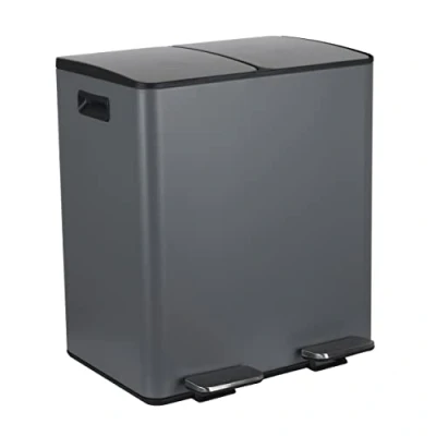 Ideal waste separator - Material: stainless steel casing, plastic inner bin. Resistant to scratches and rust. With this waste separator (40 litres), sorting waste is child's play. A double sorting is very practical with the three inserts (20 litres each). The high-quality stainless steel guarantees a long service life and contributes to an elegant look. The foot pedals are noticeably coloured. Non-slip pedal makes opening easy to use. In everyday use, it proves to be very stable and quiet 8 robust inner bins made of black high-quality plastic (PE polyethylene). The three removable containers are wonderfully sufficient for waste separation. Extensive, easy to clean – fits indoors, e.g. in any kitchen or office, also ideal for cellar, garden etc. With the practical carry handle on the back, transport is easy. The inner bucket and the housing are easy to clean, simply clean with water and standard household cleaners, so hygiene is maintained Dimensions: 30 x 45 x 51 cm. Material: stainless steel and plastic