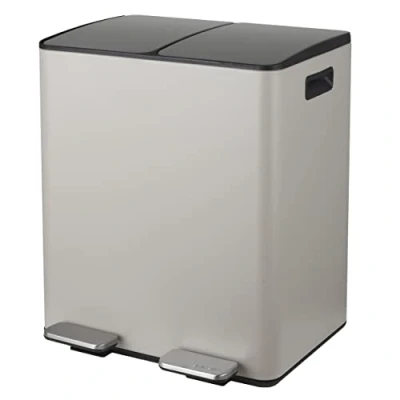 Ideal waste separator - Material: stainless steel casing, plastic inner bin. Resistant to scratches and rust. With this waste separator (40 litres), sorting waste is child's play. A double sorting is very practical with the three inserts (20 litres each). The high-quality stainless steel guarantees a long service life and contributes to an elegant look. The foot pedals are noticeably coloured. Non-slip pedal makes opening easy to use. In everyday use, it proves to be very stable and quiet 8 robust inner bins made of black high-quality plastic (PE polyethylene). The three removable containers are wonderfully sufficient for waste separation. Extensive, easy to clean – fits indoors, e.g. in any kitchen or office, also ideal for cellar, garden etc. With the practical carry handle on the back, transport is easy. The inner bucket and the housing are easy to clean, simply clean with water and standard household cleaners, so hygiene is maintained Dimensions: 30 x 45 x 51 cm. Material: stainless steel and plastic