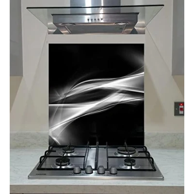 Splash back, Panel Kitchen, Toughened Glass, White Abstract Waves on the Black Background, Any Size, Va Art Glass (wide 60 x height 65 /cm)