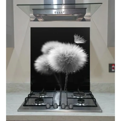 Splash back with Fluffy Dandelions Dark Background, Toughened Glass, Any Size, vaartglass (wide 60 x height 75/cm)