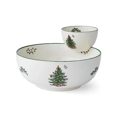 Spode Christmas Tree Tiered Chip and Dip Serving Set Festive 2 Piece for Holiday Entertaining Snacks Iconic Motif Porcelain Dishwasher/Microwave/Freezer Safe