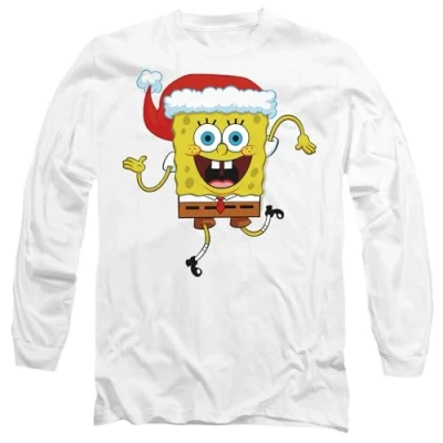 Spongebob Squarepants Christmas Santa Hat Mens Long Sleeve T Shirt, White, X Large