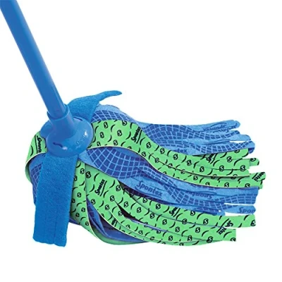 Traditional fringe mop with ultra absorbent fringes. Long lasting and machine washable. Sponge centre protects floor from scratching. Two integrated non scratch scouring strips to remove tough marks and stains. The telescopic handle extends from 80cm to 140cm to suit all users.