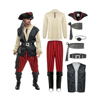 CAPTAIN HOOK COSTUME ADULT. This Pirate Costume for Men Includes 1 Hat, 1 Vest, 1 Shirt, 1 Sash, 1 Bandana, 1 Pair of Pants, 1 Pair of Shoe Covers. PIRATE COSTUME FOR MEN. is guaranteed to be Super Durable because it is made of Higher Quality materials that also boasts its unique design made with 100% Polyester for a fuss free maximum comfort. Rock this at any Animal Theme Party, Fairy Tale Dress Up Party Costume, Once Upon a Time theme Party, Theater Plays, Role-playing, Masquerade Ball, Outdoor Activity, Ocean Themed party and more! SUPER VALUE PACK FOR ROLE PLAY. Become a headturner this Halloween through this and gorgeous costume. That is super comfortable and stylish! Perfect for Halloween Dress Up Parties, Festivals, Theme Party Costumes, Best Halloween Costume, Rum Pirate Costume, Theme Party, Legend of Pirate of Seven Seas, Pirate Buccaneer Halloween Costume, Trick or Treat costume, Play period Everyday and More! Hand Wash Cold. Line Dry. Do Not brighten. Safety Test Approved. Easy to Wear, Unique Halloween Costume for Pirate Role Play. Instaworthy Halloween Costume Contest Idea! Add Lots of Fun to Your Halloween Party and Other Theme Activities! Size: Small, Medium, Large, X-large, XX-Large, Manufacturer: Joyin US Corp