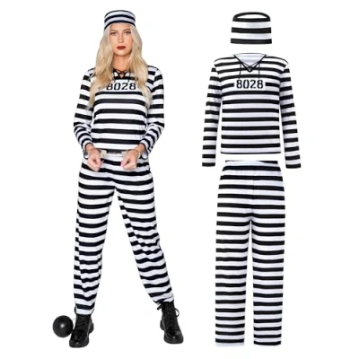 SUPER VALUE PACK. Our women's prisoner costume set includes one prisoner hat, a pair of prisoner pants, and one long sleeve shirt that has stripe design and an inmate number print. Answering the door with our jailbird costume for women for Halloween trick or treaters will surely be an interesting experience. PREMIUM QUALITY. This woman's jailbird costume is made with 100% polyester that is super durable and made with Higher quality materials that will surely last for more Halloweens to come. Our prisoner Halloween costume for women is made to be breathable for your comfort and it's nontoxic. With an enhanced stitching at seams that prevents tears. HALLOWEEN MUST HAVE. Busted! Dress up as a mischievous prisoner in this unique costume for an exciting and interesting night. A great Halloween costume party idea, but not so much for a courthouse. Our criminal costume for women is a magnificent choice for making your Halloween a memorable night. Perfect for costume parties or trick or treating with the kids. Hand Wash Cold. Line Dry. Do Not brighten. Safety Test Approved. Easy to Wear, Unique Halloween Costume for OCCASION. Robber costume adult women Add Lots of Fun to Your Halloween Party and Other Theme Activities! HOW TO CARE. Our prisoner costume adults should be hand washed. Size: Small, Medium, Large, X-Large. Fits most women's sizes., Manufacturer: Joyin US Corp