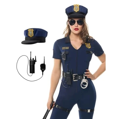 Super Value Pack. We offer you a modern and empowering combination of cute, playful and sexy women's Halloween costumes. Our police officer costume for women includes one police jumpsuit, one police hat, one baton, one hand cuff, and one walkie-talkie. This is also a fun women's cop costume to wear when answering the door for trick or treating or going out with your kids. Premium Quality. Our cop costume for women is made with 95% polyester, 5% Spandex that is super durable and made with Good Quality materials that will last for more Halloween to come. This lady cop costume has enhanced stitching at the seams that prevents tears. That jumpsuit is made out of materials that are breathable and high quality. Call 911. This female police officer costume will add excitement to the annual Halloween costume party. You can even pretend to arrest a few people with your handcuffs and toy baton. Other women will be jealous of all the attention you get from the male party goers when you dress up in uniform. Perfect Halloween cop costume set to dress up for Halloween, cosplay party, theme party,etc. How to Care. Our sexy womens police costumes should be hand washed cold. Line Dry. Do Not whiten. These womens cop Halloween costumes are Easy to Wear, care for, and clean. Size: Available in 4 sizes.S (Small), M (Medium), L (Large), XL (X-Large) , Which fits most women.