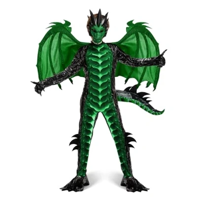 Super Value Pack: This green dark dragon costume set includes 1 dragon jumpsuit with tail, 1 pair of gloves, 1 mask and 1 pair of detachable wings. The dragon mask and gloves will give your child the full dragon experience, while the tail and detachable wings added a great touch to the costume Quality: Crafted from 100% polyester and safety test approved materials, this dragon jumpsuit costume is durable, comfortable, and resistant to most chemicals, stretching and shrinking, wrinkles, mildew, and abrasion, ensuring a memorable Halloween experience for your child Special Occasions: The dragon and wings are the perfect addition to this dragon costume, and the detachable wings make it easy to wear, store, and move around in. Get ready to take flight and unleash your inner dragon with our costume set. Perfect for Halloween dress-ups, costume parties, theme parties, stage performances, and role play, our deadly dragon costume set is sure to be a hit. Let your imagination soar as you transform into a powerful and majestic reptile Care Instructions: To maintain the good condition of this dragon outfit, we recommend sponge cleaning or hand washing. Please avoid usingwhiten, tumble drying, or ironing Perfect Fit: Our dragon costume set is designed for children and available in three sizes (Small ( 5 - 7 yrs), Medium ( 8 - 10 yrs) and Large ( 10 - 12 yrs)), which is suitable for kids of different ages and ensures a great fit. Please refer to the size chart for accurate measurements, Manufacturer: Joyin US Corp