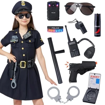 Our Girls Police Costume includes button-up dress with belt, Hat, Walkie-Talkie, Handcuffs, Whistle. Police accessories for up to 5 Kinds. Police Costume Set. Switch from your kid’s old scary Halloween costume and get this cute Cop Costume for Girls! Halloween has never been this cool and exciting! This is made Super Durable with Good Quality. Shirt, Pants and Hat are Made of Polyester. Other accessories are Made of Durable Plastic. Belt is Made of Artificial Leather. Super Value Pack for Role Play. Perfect for Halloween Dress Up Parties, Festivals, Theme Party Costumes, Best Halloween Costume, Carnival Cosplay, Themed Parties, School Play Costume, and More. Hand Wash Cold. Line Dry. Do Not Bleach. Safety Test Approved. Easy to Wear, Unique Halloween Costume for Themed Parties. Instaworthy Halloween Costume Contest Idea! Add Lots of Fun to Your Halloween Party and Other Theme Activities! Size: Toddler ( 3 - 4 yrs), Small ( 5 – 7 yrs), Medium ( 8- 10 yrs) and Large ( 10- 12 yrs), Manufacturer: Joyin US Corp