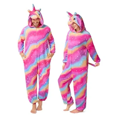 Complete Costume Set: Our pajama set includes a rainbow unicorn hooded jumpsuit, this costume comes with a 3D unicorn horn on the hood and vibrant, colorful fabric that adds and mystery, the main colors of the clothes are naturally connected by pink, purple, yellow and blue, and ready to leap into fun, a great choice for your coming halloween pajama party. Quality Material: Crafted from 100% knitted polyester, our rainbow unicorn jumpsuit costume is soft, stretchy, and comfortable for all-day wear. Featuring a loose-fit design with a convenient zipper closure and practical side pockets, colorful design and comfortable fit make it a perfect choice for both fun and relaxation. Perfect Fit: The rainbow unicorn jumpsuit is available in sizes S, M, L, XL and XXL to fit most adults. Model is 6'1", 187 lbs, wearing size M. Be sure to check the size chart for the best fit. Refer to the size chart to find your ideal fit.Refer to the size chart to find your ideal fit. Perfect for role-playing, halloween themed gatherings, and parties. Easy Care: This rainbow unicorn outfit is both soft and long-lasting.To keep the pajamas fresh and clean, we recommend sponge cleaning. Hand washing is also an option. Please refrain from using brighten, tumble drying, or ironing to maintain the quality and simulation shape. Multiple Occasions: Our unisex rainbow unicorn costume is suitable for various occasions including Halloween dress-ups, costume parties, Halloween night events, cosplay parties, animal theme parties, stage performances, and role play. Embrace your unicorn costume and make a splash at any event with our captivating costume.