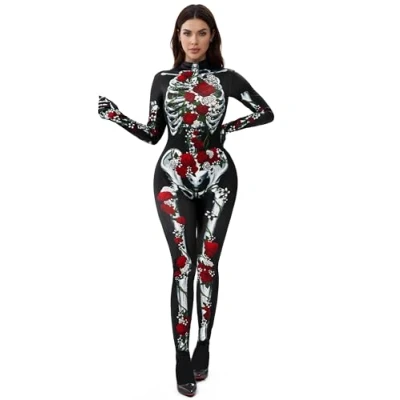 Package Includes: Women Halloween Costume includes 1 Floral Skeleton Jumpsuit. A dramatic and edgy full-body outfit that blends spooky with stunning. Soft & Stretchy Fabric: Skeleton costume made from 88% knitted polyester and 12% spandex. Super stretchy, breathable, and comfy for all-day wear. Sponge clean only. Do not brighten, tumble dry, or iron. Flattering Fit Options: Available in M, L and XL. Designed with a slim-fit silhouette that hugs your curves. Model is 5'8" and 136 lbs, wearing size M—check the size chart before ordering. Stylish & Edgy Design: Pullover jumpsuit with hidden back zipper. Features realistic skeleton bones combined with blooming roses and vein details—perfect for a bold gothic statement. Versatile Occasions: Great for Halloween parties, gothic photo shoots, cosplay events, club nights, or spooky stage performances. Stand out with haunting beauty and fierce confidence., Manufacturer: Joyin US Corp