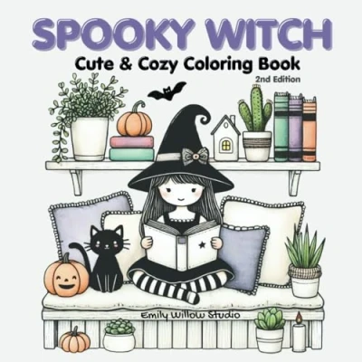 Spooky Witch: Cute and Cozy Coloring Book for Adults Teens Featuring a Witch Her Cat in Hygge Scenes (Spooky Coloring)
