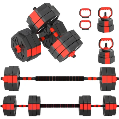 General description This 4-in-1 SPORTNOW adjustable dumbbell set can be used as dumbbells, barbells, kettlebells, and a push-up stand, making it easy to switch up your routine whenever you desire. It is suitable for both beginners and experts, allowing you to add or lower the adjustable weights for a comfortable workout. This set is great for exercises such as bicep curls, squats, shrugs, lunges, and bench presses, enabling you to work your entire body and improve your strength and overall health. Technical specifications Colour: Red Materials: PVC, Sand Overall Dimensions: 125L x 18W x 18H cm 2.5 kg/2 kg Plates Dimensions: 19.5L x 18W x 4H cm 1.5 kg/1.25 kg Plates Dimensions: 16L x 15W x 3.5H cm Dumbbell Bar Dimensions: Φ2.5 x 50L cm Item Label: A91-414V04RD Box quantity: 2 Other information Standard 1 (2.5 cm) plate hole fits most home gym bars and equipment Plastic surface is tough, odourless, and rust-resistant Non-slip handlebars for easy holding and lifting Spinlock collars
