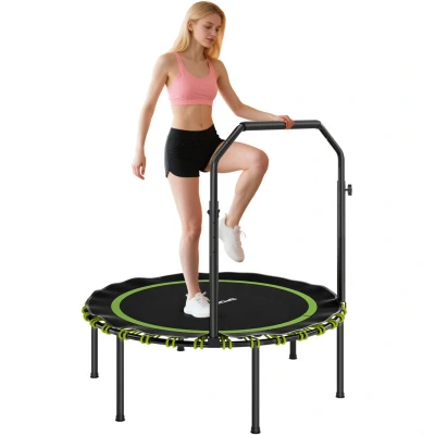 General description Stay active at home with the SPORTNOW mini trampoline, great for small spaces. Its five-level adjustable handrail offers balance and confidence, especially for beginners. Enjoy joint-friendly bouncing with 28 high-elasticity bungee cords. When done, fold it flat for easy storage. Amazing for home workouts! Technical specifications Colour: Green Material: Steel and PP Overall dimensions: 109-129H x Φ101cm Folded dimensions: 10H x 74L x 35Wcm Jumping mat diameter: Φ80cm Jumping mat height from ground: 32cm Handrail dimensions: Φ2.5 x 72Lcm Maximum load: 100kg Other information Adjustable five-level handrail for safety and balance 28 high-elastic bungee cords reduce joint impact for comfortable, safe workouts Foldable design saves space, allowing easy storage anywhere Steel frame and six anti-slip legs for stability Versatile indoor/outdoor use, fits various spaces for flexible exercise options Simple assembly required