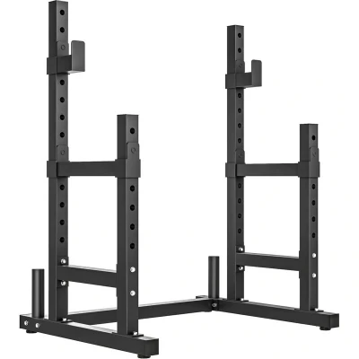 Dual barbell rack design: Enjoy two tiers to place the barbell at the top for exercises like squats, overhead presses and curls or at the bottom for deadlifts or rows. If you have a bench, use it for bench presses too, adding versatility to your workout. Adjustable height: The upper rack features 13 adjustable settings from 48-135 cm, while the lower one offers six settings from 45-85 cm. Easily find the right height for squats, bench presses or rack pulls, making it suitable for all users. Steel stability: Constructed from solid steel tubing, this squat rack provides stability. The upper rack supports up to 200 kg, while the lower rack up to 300 kg. An H-shaped base and safety spotters provide balanced and secure training sessions. Organised plate holders: Keep your home gym neat with two plate holders that fit 2" weight plates, eliminating clutter and preventing weights from being scattered on the floor. Overall dimensions: 145H x 110L x 91W cm. Barbell plate holder: Φ5 x 20L cm. Assembly required. Note: Pair this equipment with your own barbells and plates (not included) to complete your fitness setup.