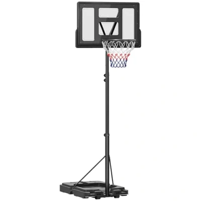 General description Fancy a game of basketball? Get everyone involved with this SPORTNOW portable basketball hoop! With an adjustable height of 160-305cm, it's great for all ages and heights. Just fill the base with water or sand to keep it stable and balanced. Its shatter-resistant backboard and dual-spring rim are ready for intense sessions. Plus, wheels at the bottom make for easy movement, so you can set up anywhere for thrilling games of shooting hoops! Technical specifications Colour: Black Material: Steel, plastic, and PE Backboard dimensions: 70H x 110W cm Base dimensions: 15H x 105L x 68W cm Hoop diameter: ⌀45 cm Hoop height: 160-305 cm Item label: A61-063V00BK Base supports: 80 kg water, 100 kg sand, or 120 kg sand and water mixture Usage Adjustable height settings: 10 options from 160 cm to 305 cm Fill the base with water or sand for stability Use the ball holder to keep your ball in place