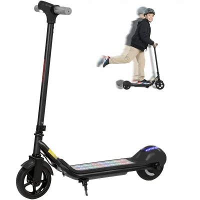 Kick-to-start motor: This kids e-scooter requires a push to 5 km/h before the motor activates for a steady, controlled launch. Powered by a 110W brushless motor, it delivers a smooth, stable ride with manually adjustable speeds up to 10 km/h Comfortable, confident rides: This kids scooter features 6.5" airless rubber tyres that absorb vibrations for a smoother journey, while the responsive handbrake brings it to a quick and controlled stop RGB lighting: Side RGB lights in red, blue and yellow on this e scooter pair with a bright white front light to boost visibility. The colourful glow stands out, letting kids ride with style and confidence Clear LED display: A handlebar-mounted screen on this electric scooter for kids shows speed and battery level, helping riders manage their journey and know when it's time to recharge Lightweight and portable: Weighing just 6.8 kg, this e-scooter is easy to carry and store. Product information: Overall Dimensions: 80W x 34D x 89H cm. Weight Capacity: 50 kg. No assembly required.