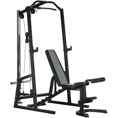 SPORTNOW Smith Machine & Cable Pulley System with Adjustable Weight Bench, Multifunction Home Gym Power Rack Lat Pull Down System, Barbell for Full Body Training, Black