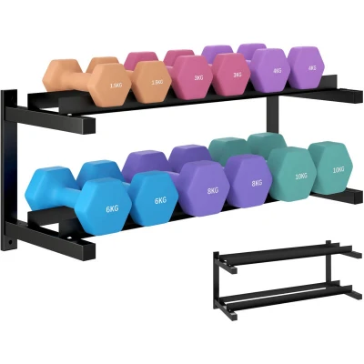 Maximise your home gym space with this wall-mounted weight rack. Its double-layer, 98 cm design holds multiple dumbbell sets, kettlebells and weight plates, keeping everything organised and within easy reach. Made from strong steel, it supports weights from 2–25 kg and stays stable during daily use. Perfect for creating a clean, clutter-free workout area, giving you more room to stretch, move and train comfortably. Specifications: ● Colour: Black ● Material: Steel ● Overall dimensions: 35H x 98L x 40W cm ● Layer height: 36H cm ● Wall-mounting hole distance: 95.5 cm ● Maximum load: 70 kg ● Item label: A91-281V00BK Features: ● Wall-mounted design saves valuable floor space, great for small home gyms ● Versatile two-tier design stores kettlebells, yoga mats and other gym accessories ● Crafted from thickened steel, it safely supports up to 70 kg ● Mounts securely to the wall, preventing tipping for safety ● A 98 cm two-tier rack offers lots of storage for multiple dumbbell pairs ●